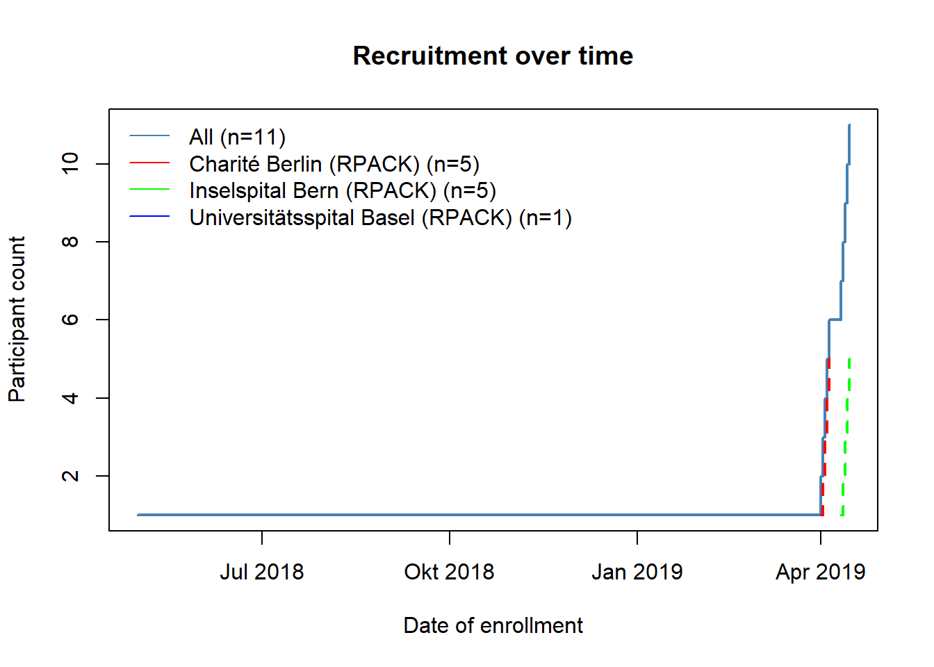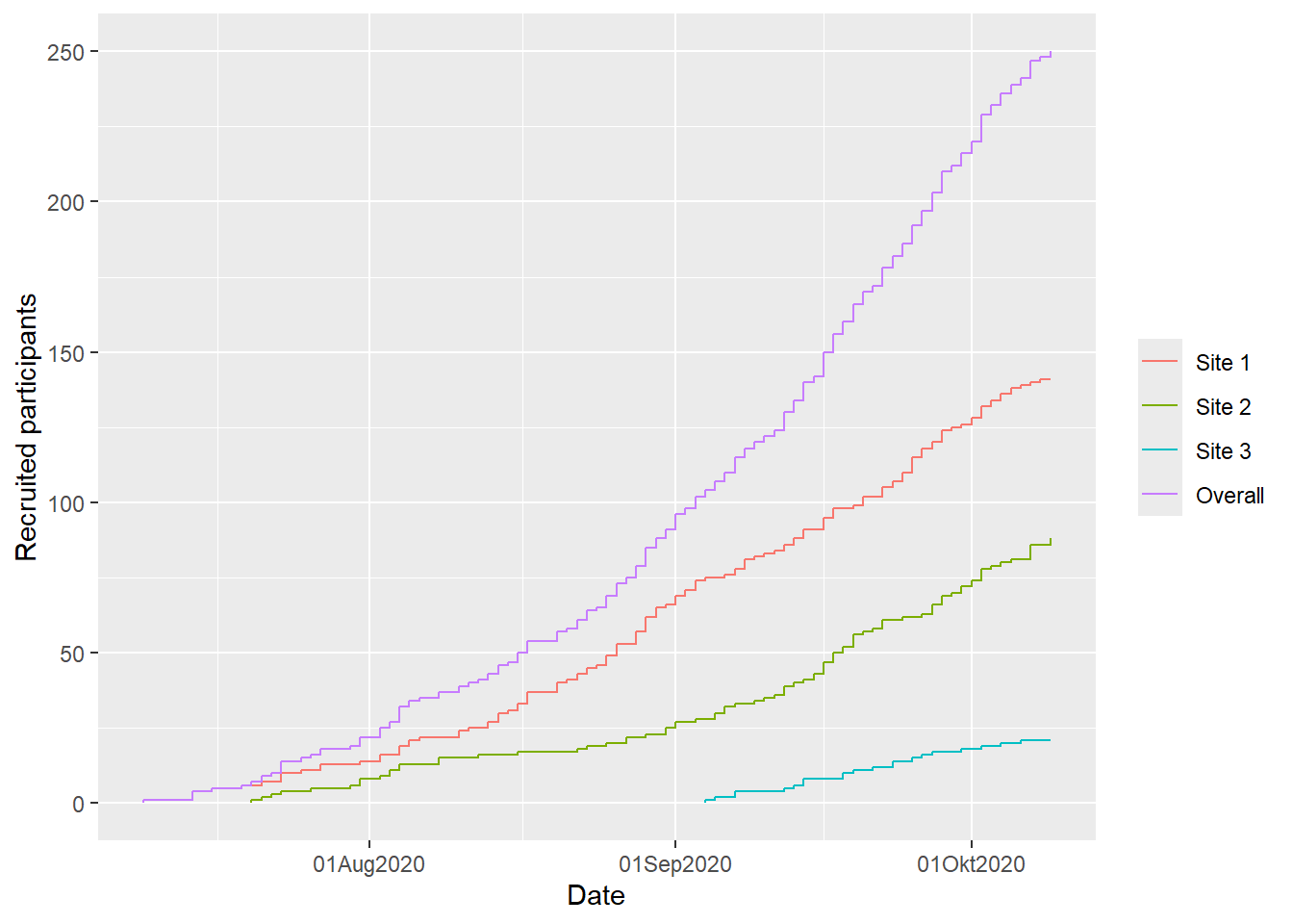 accrualPlot includes a simulated dataset of participants recruited into a trial in one of three sites. The accrual_create_df function is used to define the properties of the sites (e.g. start dates if that differs from the first participants recruitment date). The plot and summary functions can then be used to plot or tabulate the data. The data can be plot using either base graphics or ggplot2.